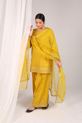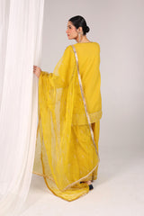 An embroidered classic-fit kurta featuring a round neckline with a V-slit, adorned with delicate mukaish detailing. The sleeve hems and shirt borders showcase gold pani motifs, enhanced with tilla and resham embroidery, enhanced with tiny mirror work. Paired with an embroidered farshi shalwar and a matching organza dupatta, edged with kiran borders and subtle mirror embroidery.