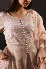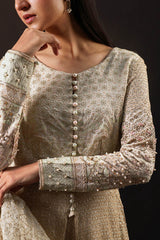 Heavily embellished open-front shirt with a round neckline accented with pearls along the front. Richly embellished with threadwork, pearls and sequin work along the front and back. The fitted sleeves feature layered embroidery and embellishments along with pearl detailing and a button closure. Paired with fully lined chiffon culottes embroidered in complimentary motifs. comes with a matching organza dupatta fully laden with sequin embellishments and handmade gota and beaded tassels.