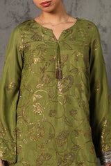 Sequin embellished classic-fit shirt adorned with beaded tassel detailing along the V-slit. Accented with gota lace on the hem, side slits and sleeve hems. Paired with a matching embellished farshi shalwar finished with gota lace, and styled with an embroidered cotton-net dupatta finished with gota lace.