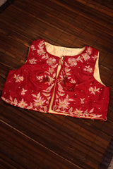 Embroidered classic-fit sleeveless short koti with a round neckline, finished with bead tassel detailing and delicate sequin accents.