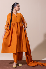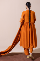 Embroidered flared shirt with a low band neckline, adorned with delicate stitching and button detailing. Features embroidered sleeves and soft gathers around the empire waist for a graceful flare. Paired with straight-fit trousers for an elegant, balanced look.