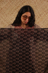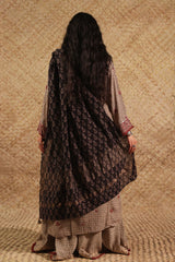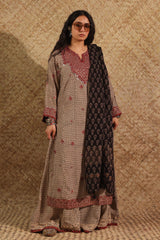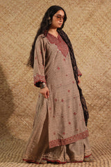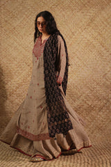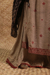 Crafted from 100% organic hand-dyed Ajrak shirt crafted in a classic, relaxed silhouette, finished with delicate embroidered detailing along the rounded neckline and V-slits. The intricate embellishment adds a subtle shimmer against the rich base. Paired with a matching printed sharara, completed with embroidered detailing along the borders for a festive finish. Paired with a contrast block-printed dupatta.