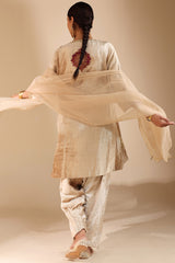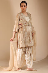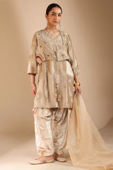 Rich crushed velvet classic-fit shirt, delicately adorned with intricate embroidery and enhanced with gota work. Paired with a classic-fit velvet shalwar and styled with a short, sleeveless, front-open velvet koti finished with tassel detailing. The look is completed with an organza dupatta edged with gilded lace accents.