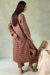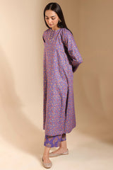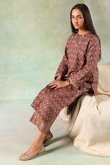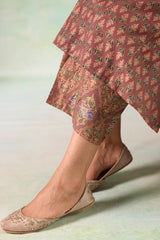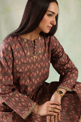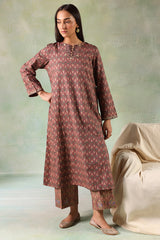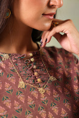 A straight-fit gold-printed shirt with a round neckline and loop buttons along the front placket, featuring subtle pleat detailing. Adorned with delicate embroidery on the neckline and sleeve hems. Paired with complementary straight-fit trousers for a refined look.
