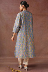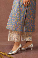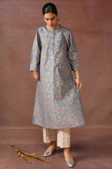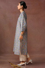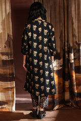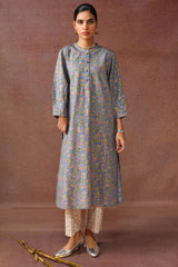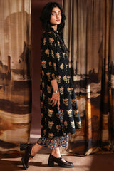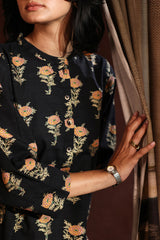 A classic-fit floral gold-printed shirt with a low band neckline and buttoned front placket, featuring a round hem. Paired with complementary straight-fit trousers.
