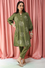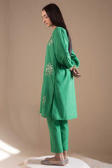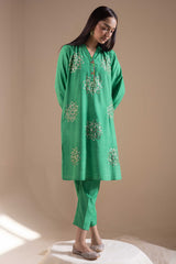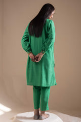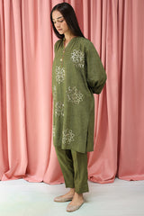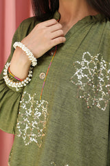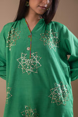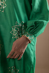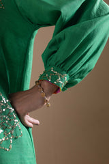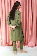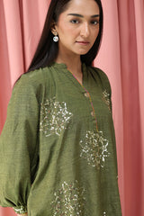 Hand-embroidered classic-fit shirt with a low band neckline and gilded button detailing along the placket, accented with subtle sequin work. Soft gathers on the shoulders and cuffed sleeves add structure. Paired with straight-fit trousers for an effortless look.