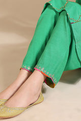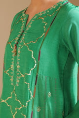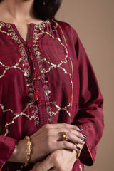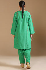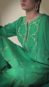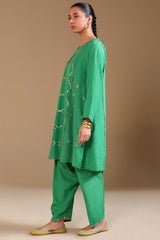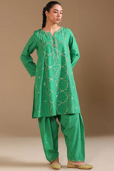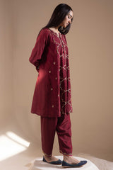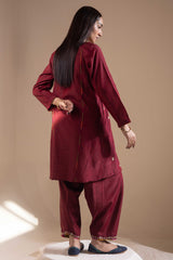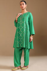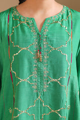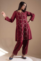 Hand-embroidered paneled shirt with a round neckline and V-slit, adorned with tassel detailing. The shirt features delicate thread and sequin embroidery for a touch of artistry. Paired with a classic-fit shalwar featuring delicate stitching detail along the ankle hemline.