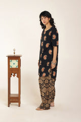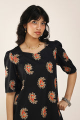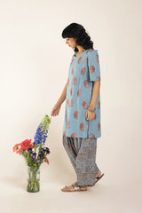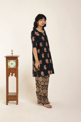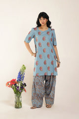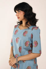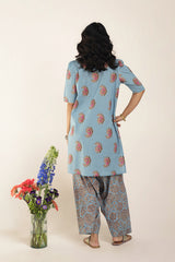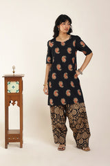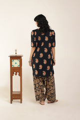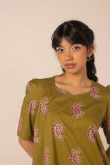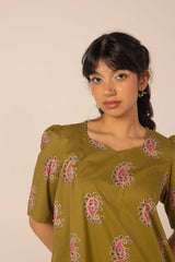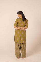 A classic-fit paisley-printed kurta featuring a V-neckline adorned with intricate Mukesh detailing. The puff sleeves add a touch of volume and grace. Paired with a contrasting gota-glow printed farshi shalwar, finished with delicate stitching details on the ankle hemline, creating an effortlessly elegant ensemble.