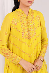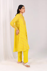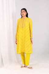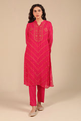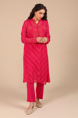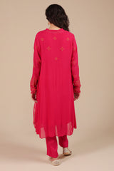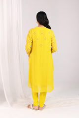 A hand-embroidered shirt featuring a button-loop front slit, adorned with kacha taanka embroidery and subtle mukaish highlights. Scattered motifs at the back add charm from every angle. Paired with solid straight-fit trousers for a timeless, refined look.