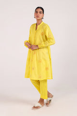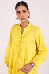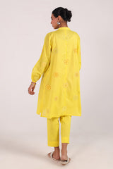 A handcrafted shirt with a low band neckline, loop button detail, and delicate pleats on the bodice. Adorned with hand embroidery and appliquŽ work, finished with cinched sleeves, and paired with straight-fit trousers.