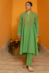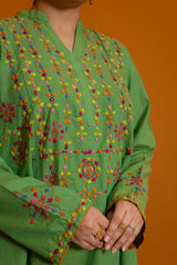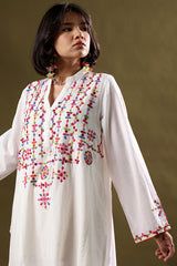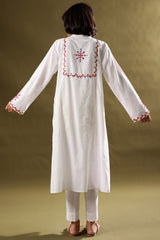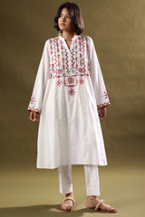 Hand-crafted paneled shirt with a low band neckline and V-slit, adorned with vibrant patti work enhanced with delicate aina detailing. Paired with straight-fit trousers for a refined, cohesive look.