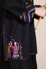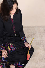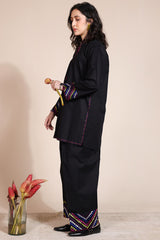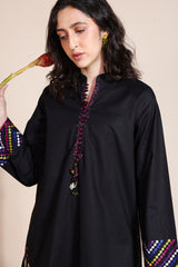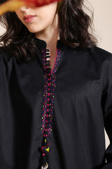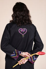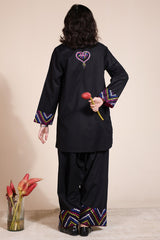 Hand-embroidered classic-fit shirt with a low band neckline and loop detailing along the front slit, adorned with heart tassel accents. Delicate embroidery graces the slit sleeves and hem, while a ‘made-with-love’ heart motif at the back adds charm. Paired with an embroidered khula poncha shalwar for an artisanal look.