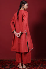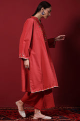 Hand-embroidered paneled kurta featuring a low band neckline with a V-slit, adorned with tassel detailing. Delicate hand-embroidered motifs add an artisanal touch, enhanced with colorful embroidery along the sleeves and rounded shirt hem. Paired with classic culottes for a refined look.