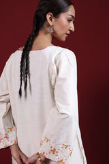 Hand-embroidered paneled shirt with a square neckline and a round shirt hem, elevated with delicate floral hand embroidery. Paired with a matching hand-embroidered farshi shalwar for a graceful, traditional finish.