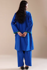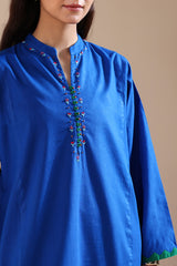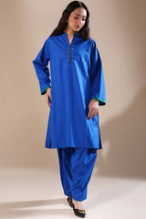 Hand-embroidered paneled kurta featuring a low band neckline, adorned with delicate stitching details and loop accents along the front slit. Paired with a classic-fit shalwar.