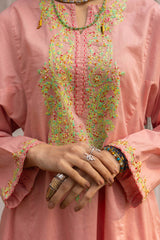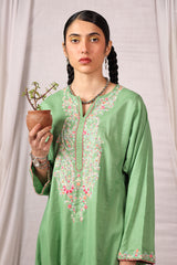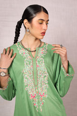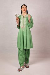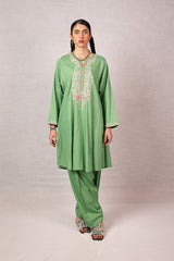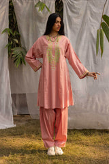 A hand-stitched, loose-fit paneled kurta features a round neckline with a V-slit. Intricate embroidered floral paisley motifs adorn the bodice, with subtle stitching details on the placket. The sleeve hems and back neckline are enhanced with embroidered details, completing the look. It is paired with a solid-color, classic-fit shalwar, featuring embroidered details on the ankle hems, offering a refined allure and heritage grace.