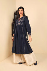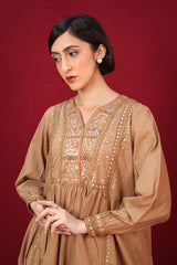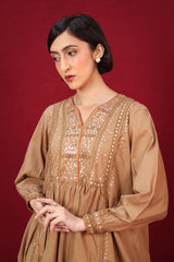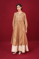 This elegant long kurti features a classic panel frock design with v-shaped neckline and gathers on sleeves hem. The kurti is subtly embellished with minimal yet graceful sequin work on sleeves, neck and panals enhanced with ribbon pipping for a pop of colors.