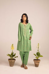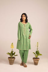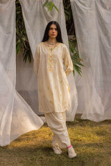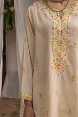 Crafted with precision, this hand-embroidered kurta features a round neckline with a V-slit, adorned with intricate handcrafted motifs. Vibrant floral designs across the kurta add depth and color, bringing the piece to life. The sleeves are enhanced with detailed embroidery. Paired with a solid-colored, easy-fit shalwar, featuring delicate embroidery on the ankle hems.