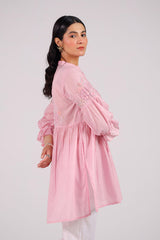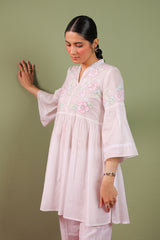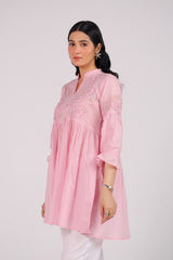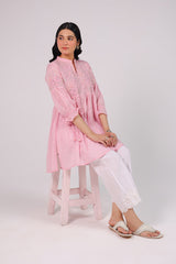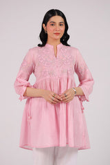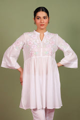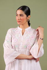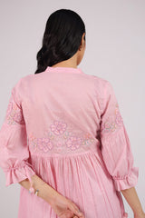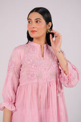A handcrafted frock adorned with delicate floral applique and embroidery on the bodice and sleeves. The gathered empire waist lends a soft, flared shape to the silhouette. Finished with gathered three-quarter sleeves and tassel ties at the sides. Can be paired with any Generation bottoms.
