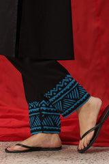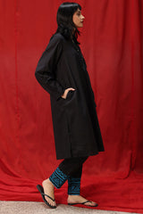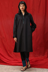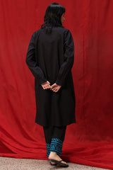 Hand-Crafted classic-fit shirt with a low band neckline and V-slit adorned with tassel detailing. Designed with subtle drop shoulders, cuffed sleeve hems, and side pockets for added comfort. Paired with straight-fit trousers featuring appliqué detailing along the borders.