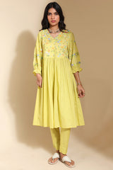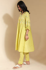 A hand-embroidered detailed flared shirt with a V-neckline, featuring gathered sleeves with a frill design and soft gathers on the bodice that enhance the flare. Paired with straight-fit trousers for an elegant, balanced look..