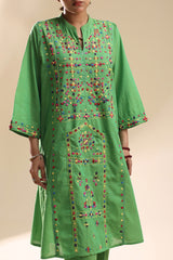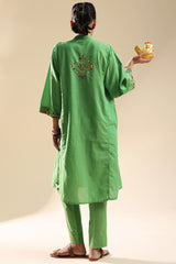Hand-crafted paneled kurta adorned with intricate tukri and embroidery, enhanced with delicate aina work. Designed with a refined low band neckline and subtle V-slit, it is paired with straight-fit trousers for an artistical look