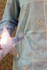 Hand-embroidered classic-fit shirt with a round neckline and subtle stitching detail along the sleeve hems. Paired with a coordinated embroidered Farshi shalwar with soft scalloped edges.