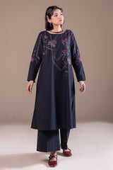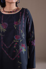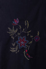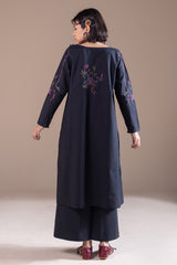 Hand-embroidered classic-fit paneled shirt with a round neckline, finished with button detailing on the shoulder and sleeve-hem slits. Paired with classic culottes for a balanced, artisanal look.