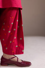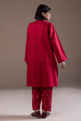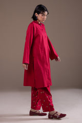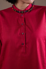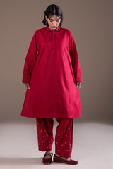 Hand-embroidered classic-fit shalwar paired with a paneled kurta having a band neckline and buttoned front placket. Finished with subtle button detailing on side slits classic, sophisticated look.