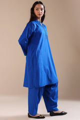 Hand-embroidered paneled kurta featuring a low band neckline, adorned with delicate stitching details and loop accents along the front slit. Paired with a classic-fit shalwar.