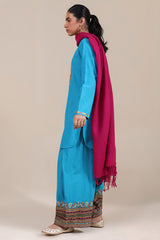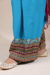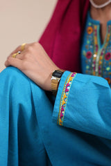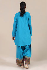 Hand-embroidered classic-fit shirt with a round neckline and V-slit, adorned with delicate embroidery and subtle sequin detailing. Finished with a round shirt hem. Paired with an embroidered farshi shalwar featuring embroidered borders.