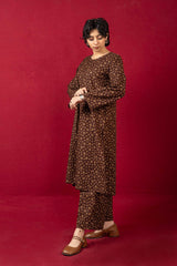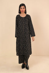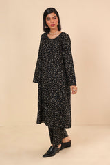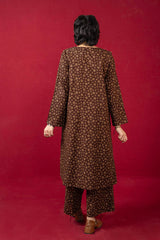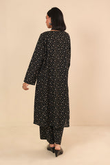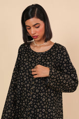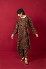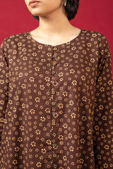 A seamless floral print loose-fit A-line shirt featuring a round neckline with embellished buttons on the placket, paired with straight trousers for a chic and effortless look.