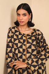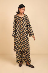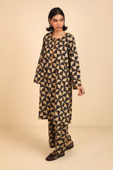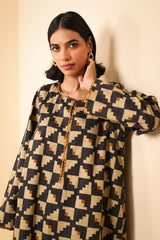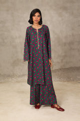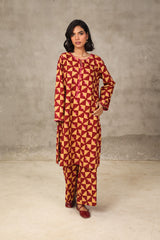 A loose fit printed flared shirt with round neckline, featuring embroidered detailing at neckline. Paired with printed loose culotte pants.