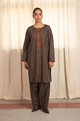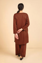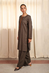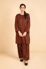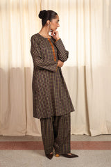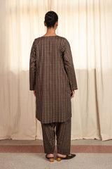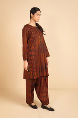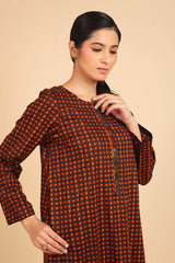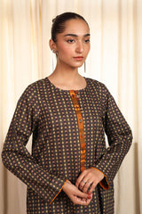 A loose fit printed shirt with round neckline, featuring buttons along the front placket. Paired with a matching printed classic fit shalwar.