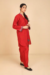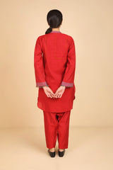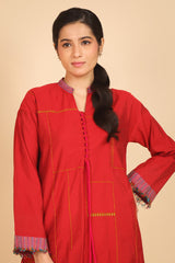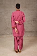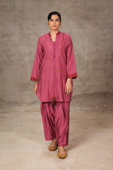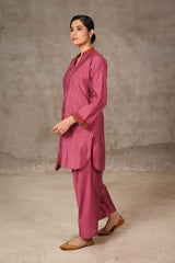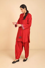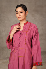 A loose fit tunic with band neckline with V detail, featuring woven piping detail on sleeve hems and tassel detailing at the front. Paired with solid colour shalwar.