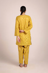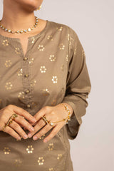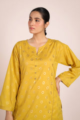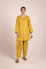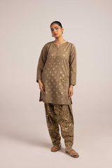 A relaxed-fit paneled kurta with a round neckline and V-slit, adorned with gilded buttons along the front placket. The kurta features a subtle foil print pattern that adds a soft sheen. Paired with a classic fit shalwar, richly adorned with bold golden foil-printed patterns and finished with fine stitching at the ankle.