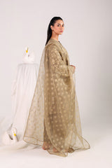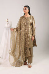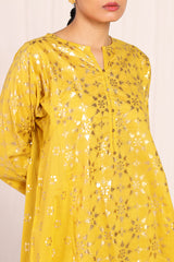 A foil-printed, classic-fit shirt featuring a round neckline with a V-slit, adorned with button detailing along the front slit. The shirt showcases a vibrant foil print and is paired with a solid-hued, classic-fit shalwar, finished with fine stitching at the ankle hem. The look is completed with a matching foil-printed organza dupatta that adds a festive charm.