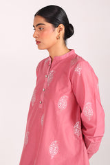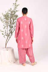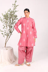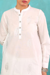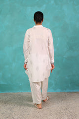 A foil printed, classic-fit kurta featuring a band neckline, adorned with delicate stitching and embellished with phool moti on the front placket. The foil-printed paisley design adds a touch of regal elegance. Cuffed sleeves with button detailing enhance the look. Paired with a matching printed classic-fit shalwar, detailed with stitching on the ankle hemline.