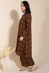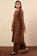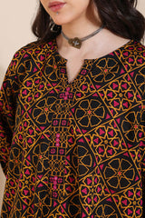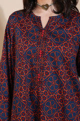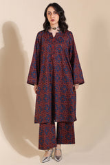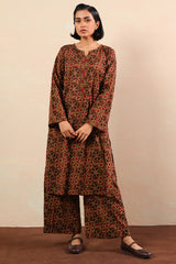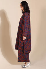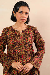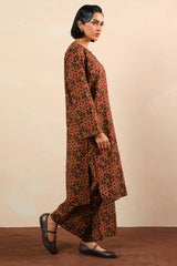 A classic-fit printed shirt with a round neckline and V-slit, adorned with subtle embellishment. Paired with printed culottes for a coordinated, stylish look.