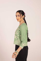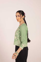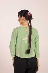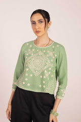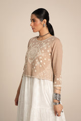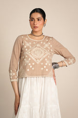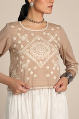 An embroidered top with a round neckline, adorned with fine embroidered details enhanced with Aina art. The sleeve hems mirror the intricate embroidery, adding a delicate touch.