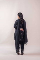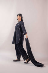 A jacquard shirt with a round neckline and V-slit, adorned with colorful loop detailing along the front placket. Paired with a jacquard-bordered classic-fit shalwar for a coordinated look.