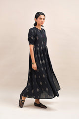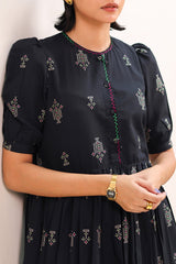 A long flared jacquard frock featuring a round neckline with a placket featuring contrast colour herringbone stitch embroidery and button detailing. Adorned with puffed sleeves with cuff detailing and gathers at the waist, this ensemble is the perfect flowy silhouette. Paired with black straight-fit trousers for a stylish look.
