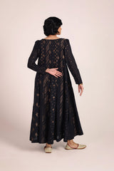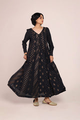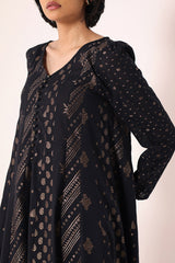 A formal, long flared frock features a V-neckline with a delicate placket adorned with button details. The puff sleeves add volume, while engraved motifs enhance its elegance. It comes with an inner for added comfort and is paired with matching printed straight-fit trousers.