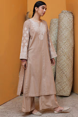 Crafted in textured jacquard, this classic-fit shirt is adorned with jacquard detailing on the neckline and sleeves, enhanced with delicate mukaish work. Finished with subtle stitching along the neckline. Paired with culottes featuring refined gota detailing at the hemline.