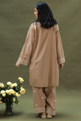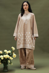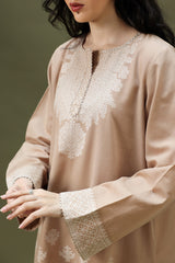Woven in rich jacquard, this classic-fit shirt is adorned with delicate gota detailing along the edges. Paired with an embroidered classic-fit shalwar featuring jacquard borders, refined side slits, and subtle gota accents at the hem.