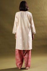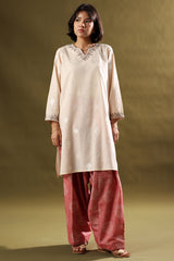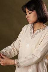 Crafted in jacquard, this classic-fit shirt is adorned with delicate embroidery along the neckline and sleeve hems, elevated with refined gota lace accents. Paired with a coordinating jacquard khula poncha shalwar, finished with gota lace detailing at the hemline.