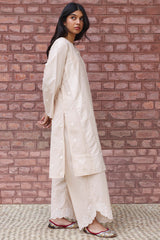 Jacquard paneled shirt tailored in a classic-fit silhouette, with a round neckline and V-slit adorned with delicate pearl detailing. Finished with subtle scalloped sleeve hems. Paired with classic culottes highlighted with schiffli borders for a refined finish.