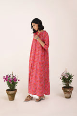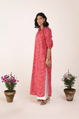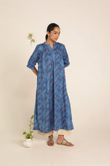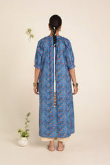 A vivid jigsaw-printed kurta featuring a band neckline with a V-slit, adorned with button and tassel details for a playful touch. The cinched sleeves add a hint of structure, balancing the vibrant energy of the print. A statement piece that can be paired effortlessly with any Generation bottoms for a bold yet breezy look.