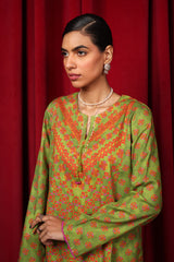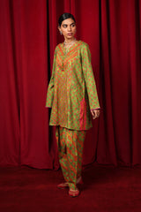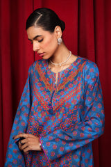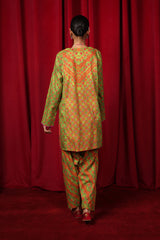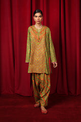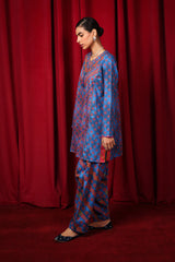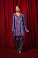 Jigsaw-printed paneled kurta features a round neckline with a V-slit, enhanced with subtle mukesh work and tassel detailing for an added touch of elegance. Paired with matching printed classic-fit shalwar, featuring running stitch details on the ankle hems, this ensemble combines style and comfort effortlessly.