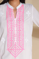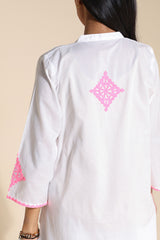 A classic straight-fit handcrafted shirt with a low band neckline and V-slit, adorned with delicate applique work and fine stitching. Can be paired with any Generation bottoms for a chic look.